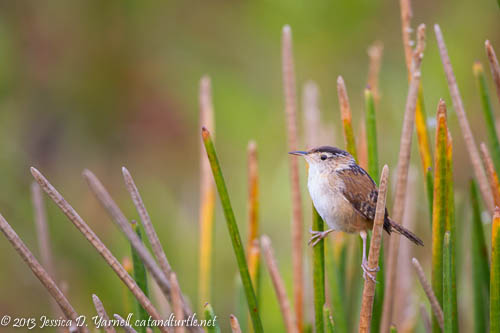 I noticed photographers checking out the Heron Hideout trail, not seeing the cranes, and moving on too quickly. You have to be patient to wait for the birds to come to you. It took them about half an hour or more to make their way across the marsh. In the meantime, I noticed this Marsh Wren hopping around in the grass in front of me. I never would have noticed him if I hadn’t been standing quietly in one place for a little while. He posed beautifully for me while I waited for the stars of the day to come up onto the trail.