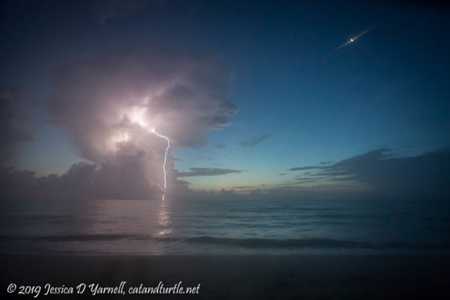 Rich and I headed to Archie Carr in mid-June to look for nesting sea turtles. We arrived well before sunrise. There was a storm off-shore with fairly frequent lightning. The moon also shone, illuminating the beach.