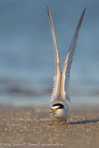 As the sun set, the light got warmer and prettier. I snapped this image at just the right second, as the male took off after delivering his last fish. I love the vertical wingspan. It’s so exciting that shorebird nesting time is again here! I hope to have the opportunity to photograph the Least Tern chicks again this year! :)