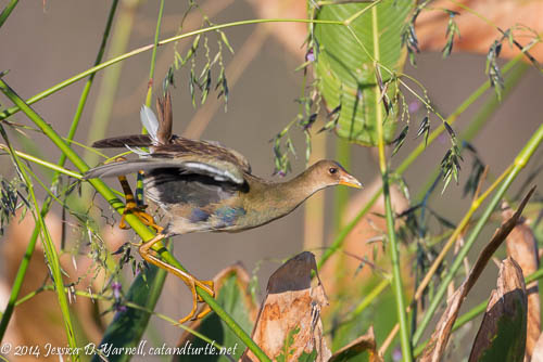 I haven’t been to the Circle B Bar Reserve in ages. I used to go so often, but it’s very different these days. Lots of people, not as many birds. I can’t wait for my upcoming visit to the Lake Hancock Outfall Wetlands, where I participated in a Christmas Bird Count last year. I’m hoping to see lots more birds there! But one thing that Circle B is really good for at this time of year is Purple Gallinules. I call them my “pole-vaulters.” You see, the alligator flag plants grow tall, and all the adult and juvie gallinules climb the reeds to eat the flower seeds. They inch out farther and farther, with those big long toes wrapped around the reed, until snap! The reed gives out under their weight and the “pole-vaulter” takes a ride to the ground. This process repeats itself quite often and is very entertaining. As a photographic bonus, the early morning light is perfect on these guys!